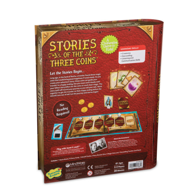 The players choose a card to be the Traveler, and the first player begins the story. As they tell the story, the first player flips over three cards and uses the three magic coins to mark which card they think should be in the story next – so only they can see. The other players guess which card they think the storyteller chose. A wrong guess means the inkwell marker goes down a notch. As a team, try to tell the tale before the inkwell runs dry! As each player imagines their part of the story, they roll the booster dice to add exciting elements that they must work into the tale. Have fun, use your imagination and work together to reach a happy ending before the inkwell runs out of ink. It’s a cooperative game that fans of fantasy, creative or role-playing games will love playing with friends and family.