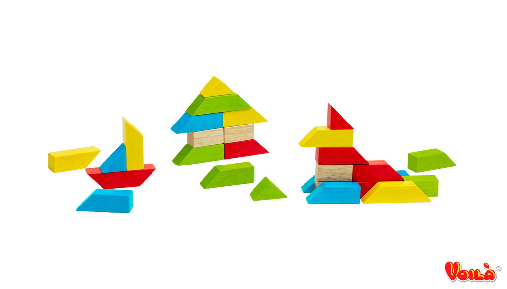 A set of 28 colorful wooden pieces. Offers unlimited scope for exercise of imagination and creative thinking.